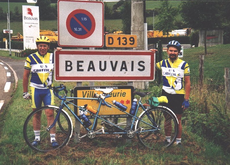 En automne 1998, l'U.S. Créteil, par le biais du journal local "Vivre Ensemble", proposait aux personnes handicapées de la ville de s'intégrer dans des activités sportives. Il se trouvait que je possédais moi-même un tandem qui vieillissait prématurément dans le fond d'une grange du soissonnais. Ce tandem, bientôt rapatrié sur Créteil puis rapidement restauré, fut mis à l'épreuve de la route d'abord sur de courtes distances pendant quelques années, monté par des pilotes improvisés, puis au fil des sorties, (et des escortes), un solo peut-être plus chevronné et assurément plus "téméraire" que les autres, se porta volontaire pour me faire partager le goût de plus longues distances. Je n'avais à l'époque alors aucune connaissance ni de la mécanique ni de la force à déployer en fonction des pourcentages des côtes, ni des différentes dénivellations qui attendent le cycliste au tournant, bref de tous ces paramètres qui font que l'on a un jour les pieds ailés ! Je me laissai donc guider doucement par Maître Alain sur le parcours longue distance de notre rallye d'automne, l'A.T.I.F, sa première prérogative ayant pourtant été posée : "Tu sais Gilles, avec moi il faudra mouiller le maillot !" Tope là ! Marché conclu, Nous allions devenir frères pour de nouvelles aventures ! Cela s'étant concrétisé de manière explosive cette année 2002, par cet objectif que nous nous étions promis d'atteindre en un an : les boucles de l'Ile-de-France, et nous avons gagné ! Nous pouvons même ajouter que nous sommes les premiers de notre club à les avoir terminées en seulement quelques mois, depuis la mi-avril jusqu'au début de septembre, en tenant compte de la rupture des congés qui a retardé pour nous la possibilité de rouler. Pour moi, que de souvenirs gravés, que d'émotions, que de joies multiples ! Egalement une belle promotion pour notre club d'avoir pu allier dans sa section handisport l'aspect promenade à l'aspect performance. Le côté cyclo par la volonté de dépassement de soi, et le côté tourisme par la découverte de sites exceptionnels rayonnant autour de notre belle capitale. Se retrouver par exemple sur le parvis de la cathédrale de Chartres en se disant : "Est-ce possible d'avoir pu rouler à l'air libre sur toute cette distance depuis Paris ?" C'est à cette occasion que j'ai dit à Alain et à l'un de nos copains du club qui nous a escorté sur plus de la moitié des boucles : "Je garde les vélos, les gars ! Entrez dans cette cathédrale et allez admirer la merveille de ses vitraux !" A Montfort-l’amaury, nous avons fait une pause d'une minute devant la maison de Maurice RAVEL, de quoi simplement relever le numéro de téléphone, ce qui me permettra d'aller la visiter au plus tôt ! Et puis ce doux plaisir d'épicurien de s'offrir une part de Pithiviers dans la pâtisserie la plus renommée de la ville ! Mais je garderai aussi en mémoire tous ces plissements de l'Ile-de-France, les caprices de ces routes aux côtes variées, rencontrées sur chacune des boucles que nous avons faites ! Certaines nous auront donné bien du mal, mais ne dit-on pas qu'à vaincre sans péril on triomphe sans gloire ! Septeuil en retour d'Evreux en approche de la région parisienne, Jouarre très bien placée aussi dans l'effort au retour de Château-Thierry, La Roche-Guillon encore à l'aller des Andelys, sans oublier bien sûr les sorties de Provins ou de Montereau et l’arrivée à Chateaufort ! Mais nous avons également été récompensé par la griserie de descentes presque vertigineuses, et c'est là que le copilote doit avoir une confiance aveugle en son pilote, qu'il doit suivre les moindres mouvements de la machine et ne doit pas faire de gestes incoordonnés ! Enfin, tout s'est royalement bien passé en la circonstance : une descente folle sur la route en S vers la vallée de l'Automne à l'aller de Villers-cotterêts, et l'effleurement des 70km/h après la montée de Jouarre ! La météo aussi nous a donné l'occasion de nous battre sous toutes les formes de climats. Nous pouvons dire que nous connaissons aujourd'hui par coeur les remontées au vent sur de longs faux plat dans des plaines dégagées qui nous ont vu poussifs mais opiniâtres, et nous le jurerons sur la tête de notre bonne foi : nous aurions eu trop honte de mettre pied à terre ne serait-ce qu'une seule seconde ! Je me souviens aussi du retour de Villers-cotterêts où le vent avait bien forci depuis le matin et où une pluie battante était bientôt devenue son alliée de choix ! Pour couronner le tout, nous étions obligés de regarder la carte tous les trois km pour ne pas nous perdre dans le labyrinthe de ces minuscules routes de campagne ! Sur Nemours, la pluie ne nous a pas porté chance non plus puisque nous avons dû "essuyé" une chute sur le pavé glissant du quartier piétonnier de Melun. C'est alors que commençait la valse des bidons qui s'en allèrent gaillardement rouler de l'autre côté de la rue pendant que nous tentions mon pilote la machine et moi, de nous remettre debout en nous tâtant les cuisses les bras et les mains quelque peu meurtris ; mais, plus de peur que de mal, nous repartions décidés sur Nemours. A l'inverse, la canicule des Andelys de la fin de juillet nous aura aussi été fatale ! Nous pouvons même dire que nous y avons laissé des plumes ! Personnellement, je me revois à l'arrivée telle une loque informe, dormant debout et sans vie ! Sinon, hormis ces détails accessoires, quelques vagues avaries : un rayon cassé dans un petit village à l'aller de Compiègne, la perte d'un papillon de garde-boue avant après les tressautements sur les pavés sévères de Montfort-l’amaury, et surtout ce dont nous pouvons largement nous enorgueillir, aucune crevaison ! alors que nous avons totalisé une distance de 1735 km, que nous avons gravi plus de 9600 m de dénivelé, et que nous nous sommes supportés de façon réciproque pendant 77 h et 