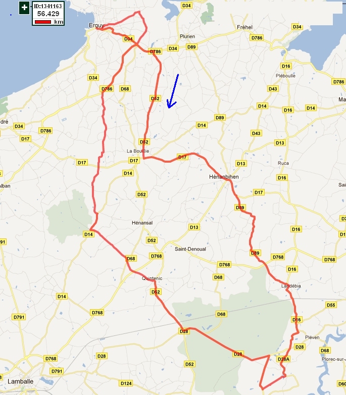 56,4 Kms :ERQUY - LES HOPITAUX - LA HIMBERT - LA BOUILLIE - HENANBIHEN - LANDEBIA - Chateau de la HUNAUDAYE - ST AUBIN QUINTENIC - LES VALLEES - LAUNAY GOURLAY - LA RIBOURDAIS - LA BONNAIE - LA CROIX ROUGE - LES JEANNETTES - ERQUY |