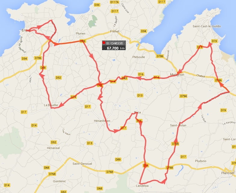 67,7 Kms : ERQUY - LES HOPITAUX - PLURIEN - ST JEAN - HENANBIHEN - vers PLANCOET - RUCA - LANDEBIA - LA VILLE OREUX - ST POTAN - La CROIX aux Merles - ST CAST - MATIGNON - MONTBRAN - ST JEAN - LA BOUILLIE - LAUNAY - ERQUY |