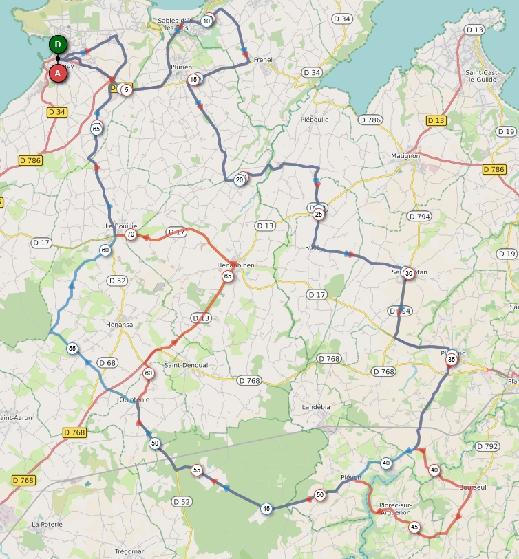 79,4 Kms :ERQUY - LES HOPITAUX – SABLE D’OR - LA CARQUOIS - FREHEL –D786 PLURIEN - ST JEAN - MONTBRAN - LE TEMPLE - RUCA - ST POTAN - PLUDUNO - ST AYDES - BOURSEUL - PLOREC - PLEVEN - ST AUBIN - QUINTENIC - ST GUELTAS - HENANBIHEN - LA BOUILLIE - LAUNAY – ERQUY 69,5 Kms :ERQUY - LES HOPITAUX – SABLE D’OR - LA CARQUOIS - FREHEL –D786 PLURIEN - ST JEAN - MONTBRAN - LE TEMPLE - RUCA - ST POTAN - PLUDUNO - ST AYDES - PLEVEN - ST AUBIN - QUINTENIC - La Vallée - LA BOUILLIE - LAUNAY – ERQUY