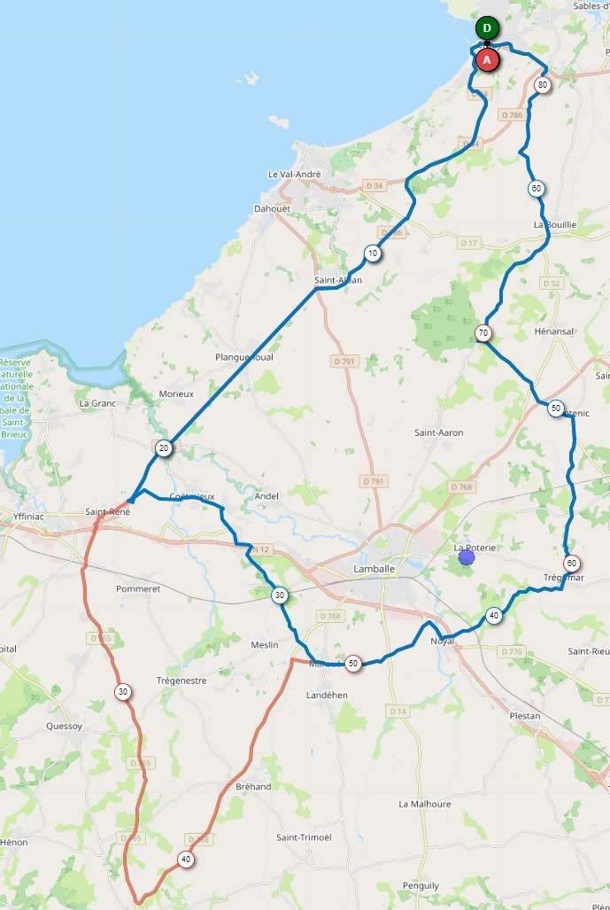 83 Kms : ERQUY - LA COUTURE - LA CROIX DES LANDES - St ALBAN- PLANGUENOUAL- ST RENÉ- GARE D’YFFINIAC- MONCONTOUR - BREHAN- MAROUÉ – NOYAL – TREGOMAR – QUINTENIC – LA VALLÉE - LA BOUILLIE - LAUNAY – ERQUY 67 Kms : ERQUY - LA COUTURE - LA CROIX DES LANDES - St ALBAN- PLANGUENOUAL- ST RENÉ- COETMIEUX Vers ANDEL - MAROUÉ – NOYAL – TREGOMAR – QUINTENIC – LA VALLÉE - LA BOUILLIE - LAUNAY – ERQUY