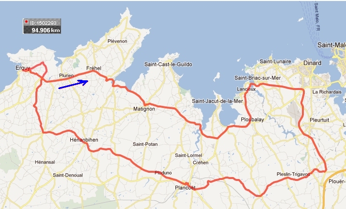 94,9 Kms : ERQUY - LES HOPITAUX – D 786 MATIGNON – PLOUBALAY – D786 LANCIEUX – D786 ST BRIAC – D603 –D266 VERS DINAN – PLESLIN TREGAVOU- D28 LANGUENAN- LA CROIX JANET - PLANCOET –PLUDUNO-HENANBIHEN - LA BOUILLIE - LAUNAY – ERQUY |