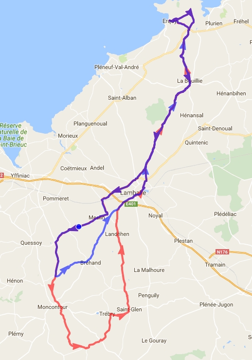 - TREDANIEL - BEL AIR - TREBRY - ST GLEN - LANDEHEN - MARQUE - LAMBALLE - LA BOUILLIE - LAUNAY - ERQUY 75 .1 Kms : ERQUY - LES HOPITAUX - LA BOUILLIE - ST AARON - LAMBALLE - MESLIN - TREGENESTRE vers QUESSOY - vers MONCONTOUR – D35 vers BREHAND - D768 LAMBALLE - LA BOUILLIE - LAUNAY - ERQUY