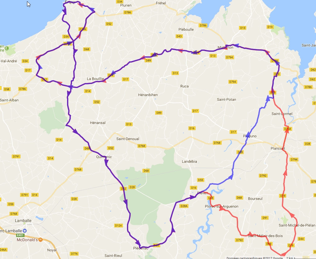 - PLOREC - ST MELOIR vers PLELAN D89 –D19 - ST MICHEL de PLELAN - PLANCOET - ST LORMEL - LA CROIX aux MERLES - MATIGNON - MONTBRAN - ST JEAN – LA BOUILLIE – LA CROIX des LANDES – LES JEANNETTES - ERQUY 79.1 Kms : ERQUY - LE CHALET - LA CROIX ROUGE - LA RIBOURDAIS - LAUNAY - QUINTENIC - PLEDELIAC - ST ESPRIT des BOIS - PLEVEN - PLUDUNO - LA CROIX aux MERLES - MATIGNON - MONTBRAN - ST JEAN – LA BOUILLIE – LA CROIX des LANDES – LES JEANNETTES - ERQUY