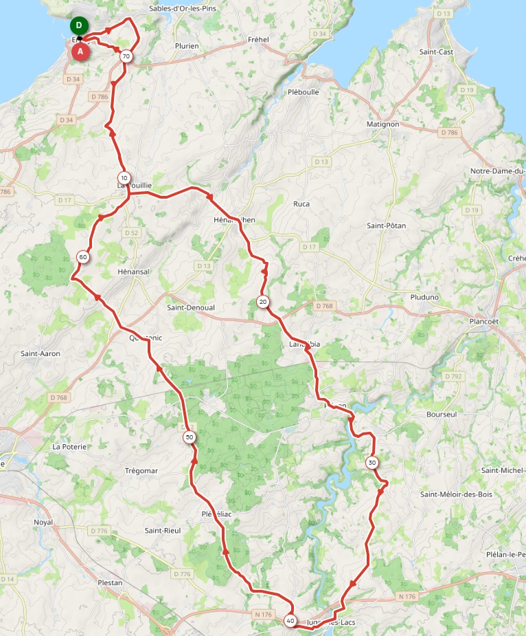 Dimanche 3 : 72,3 kms 629m dénivelé référence :3058069 ERQUY - LA BOUILLIE - HENANBIHEN - LANDEBIA - PLEVEN - PLOREC – JUGON les Lacs - ST IGNEUC – PLEDELIAC – QUINTENIC – Launay Gourlay – LA BOUILLIE – Launay - ERQUY