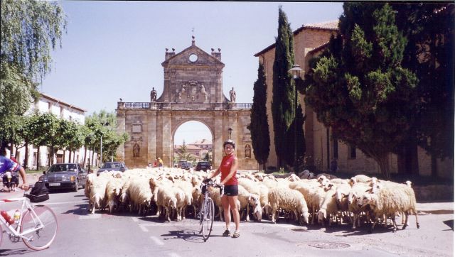 Ciel clair annonçant une belle journée ; départ vers 8H, nous sommes au pied d’une montée de 42 Km, pas très dure. Nous nous arrêtons à Villalcazar de Sirga (église imposante), puis à Carrion de los Condes (encore une grosse église, des rues carrelées, c’est plus riche !).De nombreux nids de cigognes sont perchés sur les poteaux électriques et les clochers ; après Saint Roman de la Cuba nous descendons puis remontons jusqu’à Grajal del Campos et redescendons tranquillement vers Sahagun pour une petite visite : petites rues, maisons anciennes, monastère. Direction le stade pour le pique-nique ; au passage d’une porte de la ville, nous sommes bloqués par un troupeau de moutons d’au moins 200 têtes ; le mélange moutons, voitures, vélos est assez étrange ! L’après midi, la route vers Leon est droite et monotone, il fait très chaud nous traversons des villages qui semblent déserts : El Burgo Ranero, Grajalejo de las Matas, on s’arrête pour boire et récupérer à l’ombre, vers Villarente, puis route vers Leon où nous arrivons à 16H. Nous sommes logés dans un superbe hôtel, en plein centre ville, pas loin de la cathédrale ; les rues sont très animées avec des habitants très bien habillés. La ville semble riche, les terrasses sont nombreuses ; à 19H30, il fait 35° à l’ombre ! Dîner à 20H30 à l’hôtel de Paris, et balade en ville. |