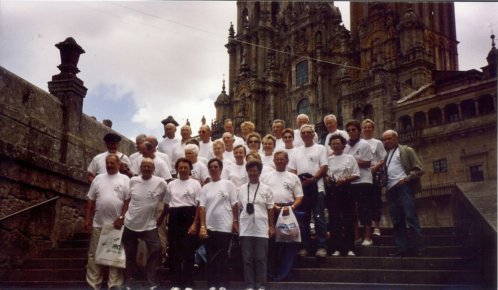 Départ vers 8H30, il ne fait pas bien chaud et les nuages sont là ; on descend en direction de Portomarin (visite de la ville nouvelle avec son église fortifiée), puis on monte jusqu’à Salgueiros, descente à nouveau jusqu’à Monterroso suivie d’une autre ascension.Le pique-nique nous attend avant Palas de Rey sous le soleil revenu, puis nous entamons la très longue descente vers Melide, Arzua et Labacolla où les pèlerins se lavaient dans le ruisseau avant d’arriver à Saint Jacques. A 20Km de notre but, une petite pluie se met à tomber, nous roulons vers le point de regroupement, (Monte del Gozo), passons la route qui y mène, faisons demi tour, et finissons par y arriver à 17h10. A partir de là, nous roulons groupés, accompagnés du Président du club cyclo de Saint Jacques, jusqu’à la cathédrale, terme de notre voyage, où nous avons droit à une photo de groupe pour le journal local. Ceux qui le souhaitent vont faire apposer le dernier tampon et recevoir leur diplôme (Crédenciale) avec les autres pèlerins arrivés au même moment que nous. Il pleut davantage, nous remontons à Monte do Gozo où nous sommes logés à l’hôtel Euro Natur San Marcos ; il est 19H30, un apéritif est prévu à 20H30 et le repas à 21H30 avec distribution de T. shirts, d’assiettes et de vases souvenirs du Camino ; nous rejoignons nos chambres à 23H45, fatigués mais satisfaits. |